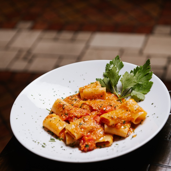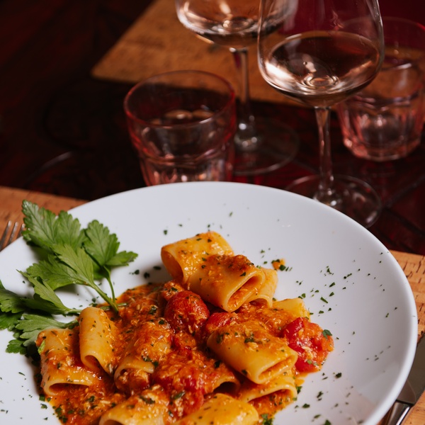 I paccheri al ragù di ricciola raccontano l’incontro tra la delicatezza del pesce e la profondità di un sugo cotto lentamente, arricchito da pomodori maturi e note di erbe mediterranee.